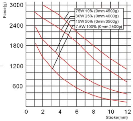 圖解:1,上圖描述電磁鐵的行程和力量曲線圖,橫向代表行程(mm),縱向代表力量(g)。
